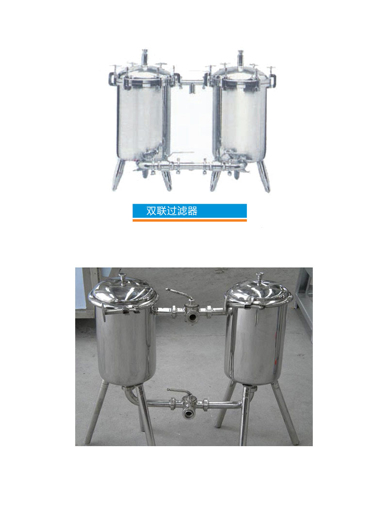 雙聯(lián)式過濾器全部采用SUA304優(yōu)質(zhì)不銹鋼制造,是二只圓柱體組成,內(nèi)外表面拋光0.4μm,頂部裝有壓力表、排氣閥,適用于除去鮮奶、糖液、飲料、口服液等液體中各種肉眼看不見的固體雜質(zhì)的凈化。兩只過濾器交替適用,可在不停機(jī)的情況下更換過濾網(wǎng),適于長期連續(xù)生產(chǎn)。